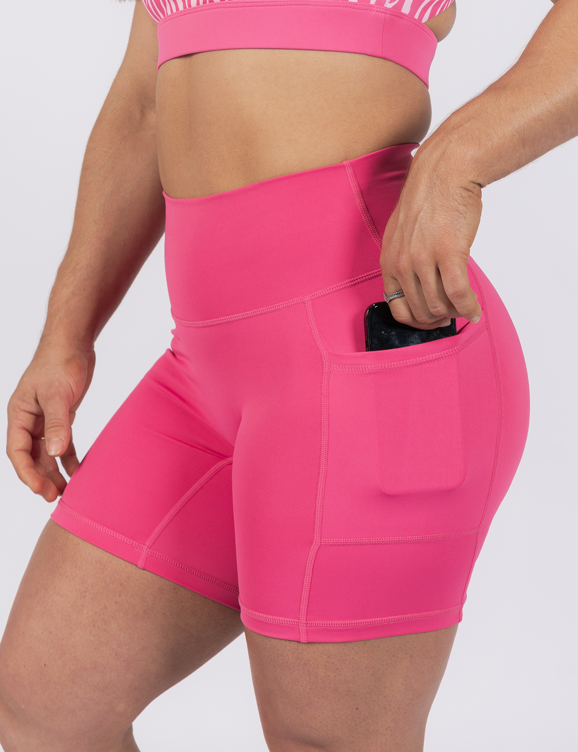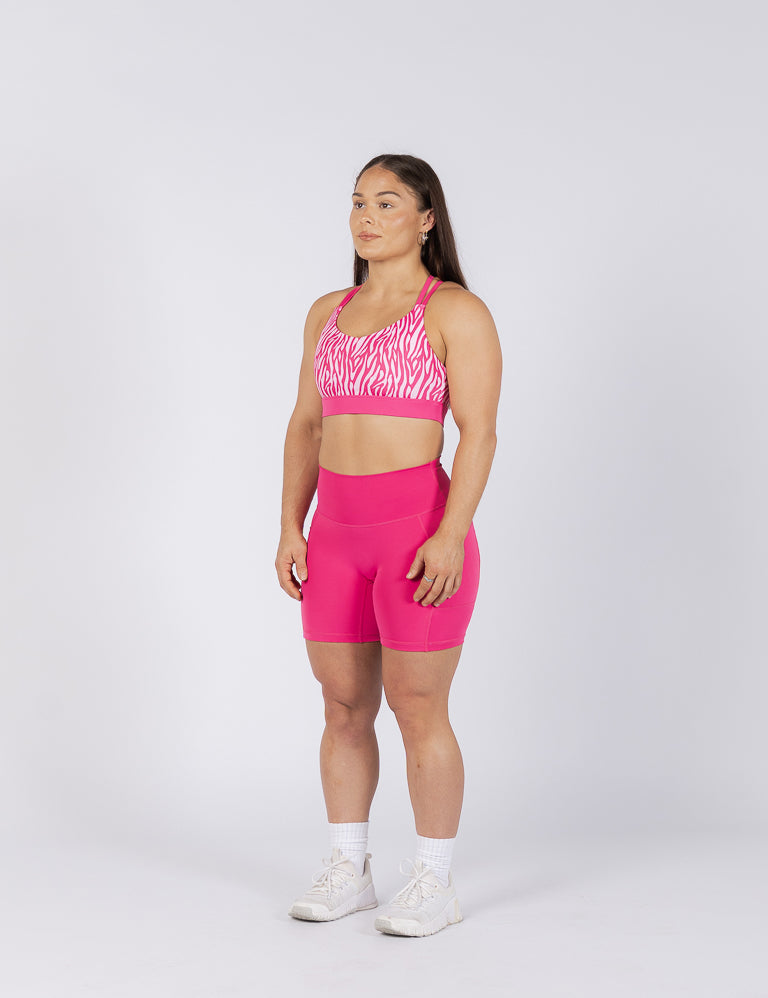 The Aada Collection is bold and unapologetic, combining soft pink with striking zebra print for a look that stands out as much as it performs. Made with a smooth, comfortable fabric that molds to your body without restriction, and designed with precision fits that move with you through every lift, every set, and every rep, this collection gives you the confidence to push harder and feel unstoppable both on and off the platform.